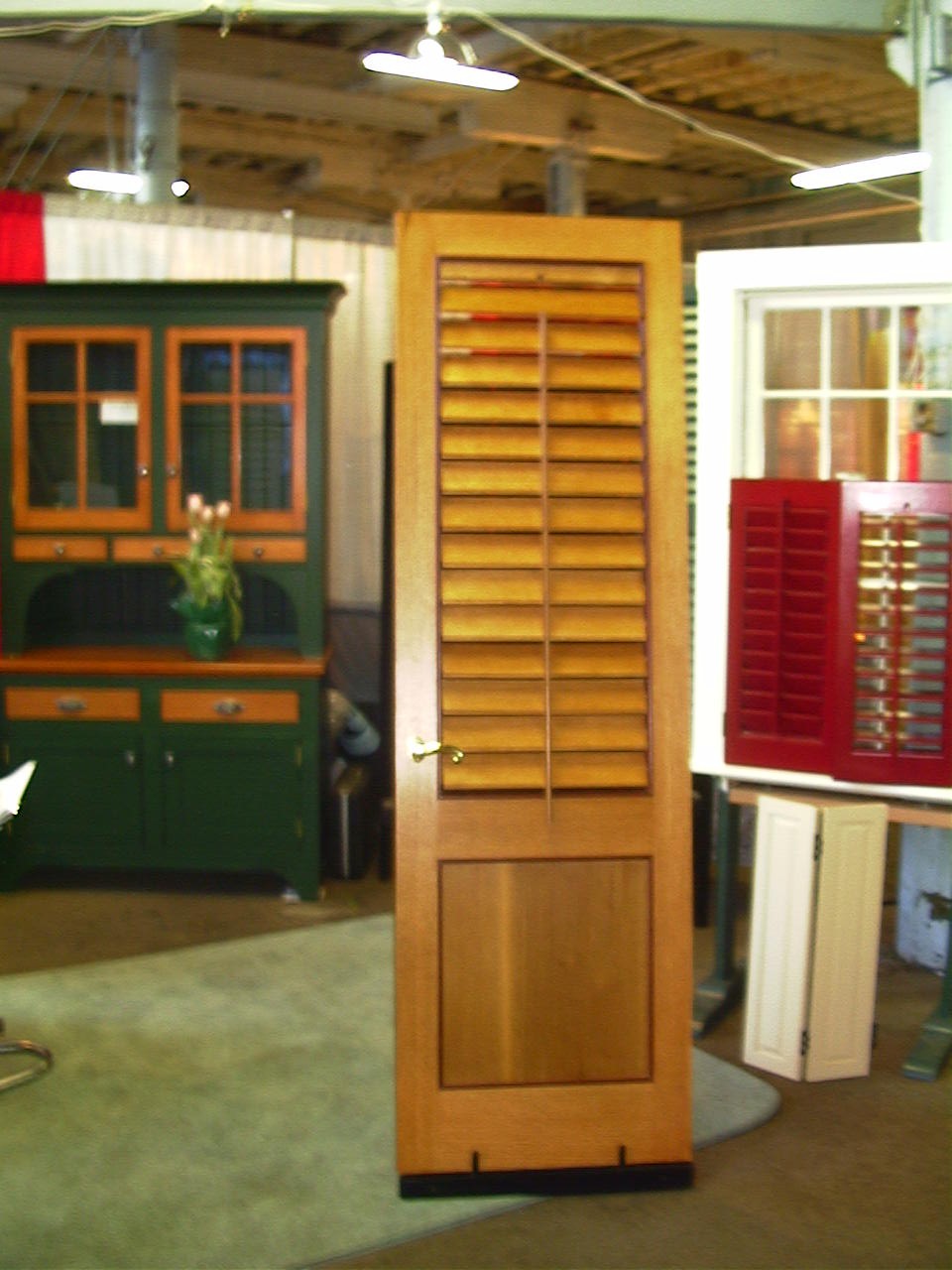 | This quarter sawn oak door has 3 1/2" operable louvers with a flat bottom panel. Stiles are 41/2", rails are,top 41/2",middle 51/2",bottom 7". Any of these measurments can be changed, also a full louver or lower raised panel can be used. | ![]() |