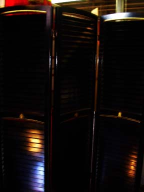| This black lacquered room screen is ideal to hide a corner or create a space.Three 18" panels 6' tall with gold leaf accents and Chinese figures. |